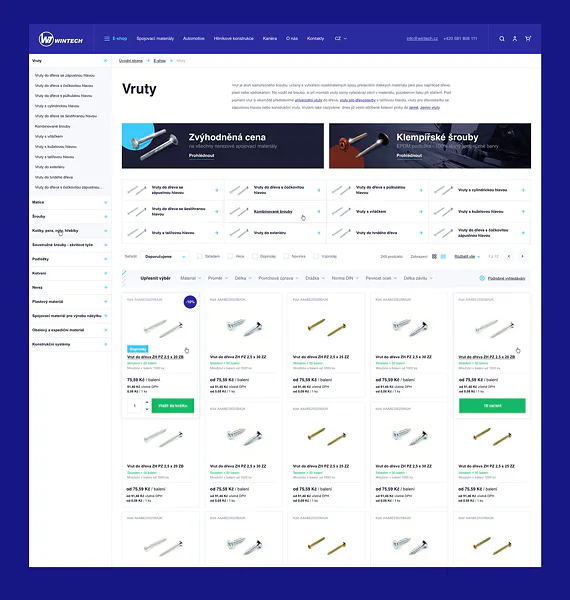 WT Wintech – specialista na spojovací materiály potřeboval spojit brandovou stránku a e-shop v jedno. Cílem projektu bylo poskytnout zákazníkům z B2C i B2B komfortní nákup nebo jednoduše navázat spolupráci. A to se díky obsahovému editoru a využití virtuálních sekcí povedlo perfektně. V e-shopu pracujeme s velkou škálou různých filtrů a virtuálních oborových sekcí, které zákazníkovi pomáhají s výběrem. Zároveň efektivní administrace umožňuje rychlou správu všech položek na e-shopu.